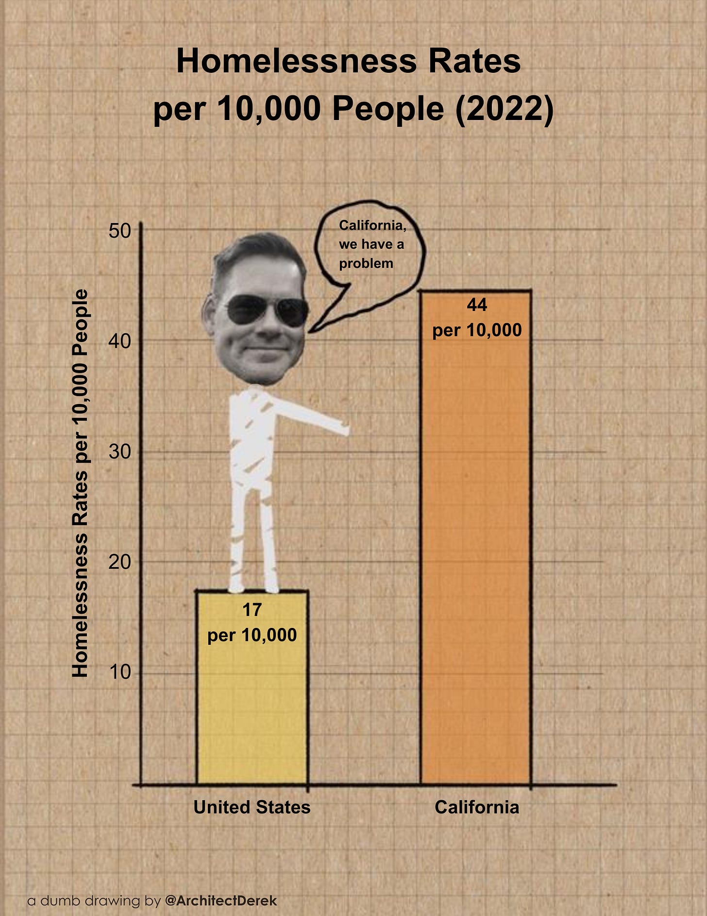 While homelessness is not the only indicator of a housing crisis, it is the most visible indicator. In my home state of California, in 2022, there were 171,000 experiencing homelessness, or about 44 per 10,000 residents, which is 2.5 times the national average.